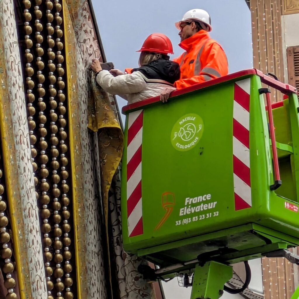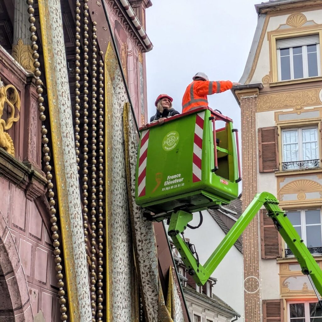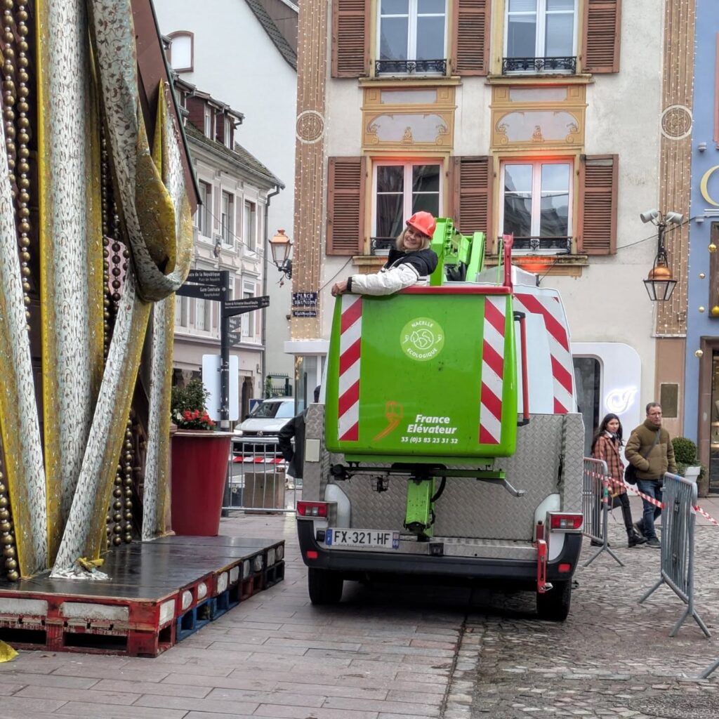 Le tissu de Noël a été installé aujourd’hui sur la place de la Réunion à Mulhouse… par la créatrice elle-même, perchée sur une nacelle !