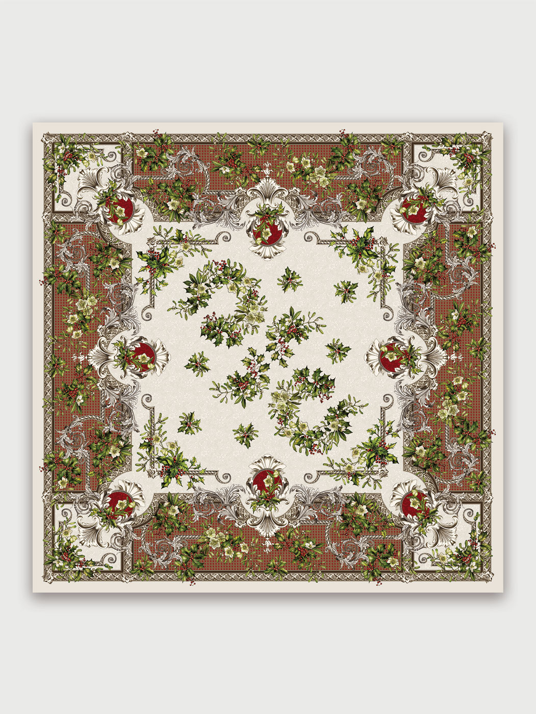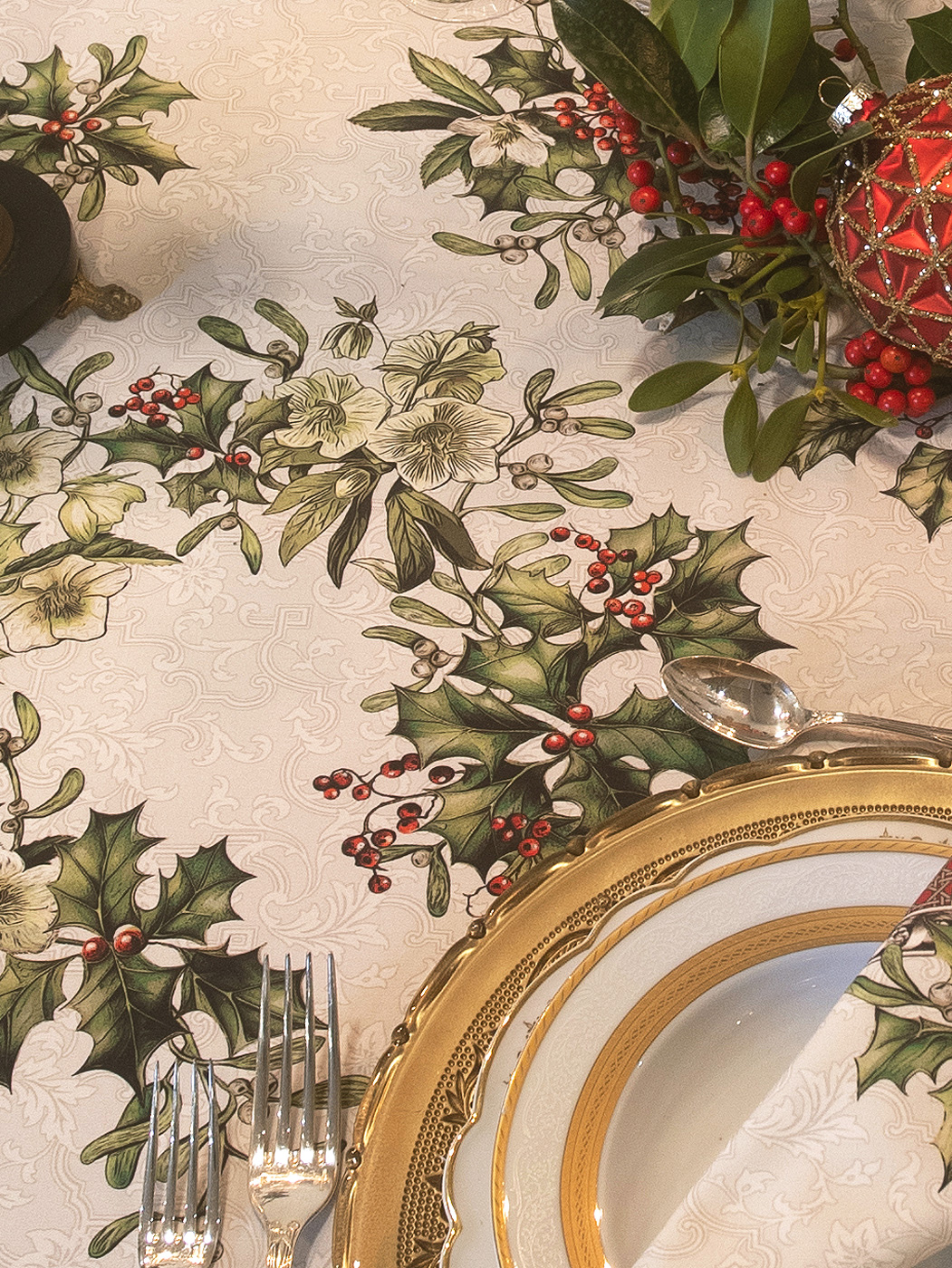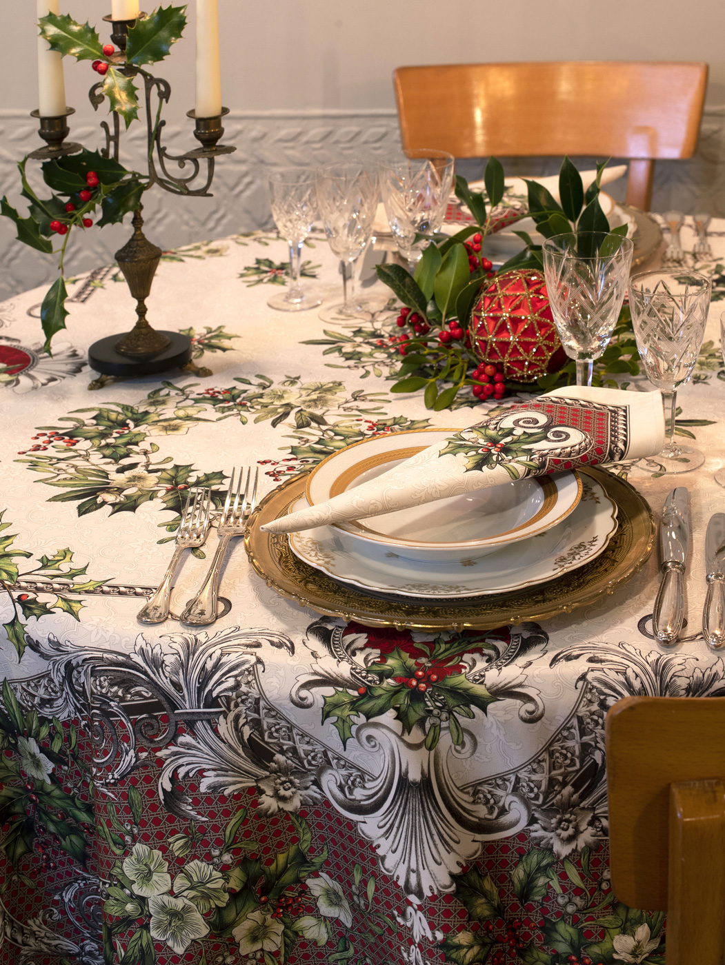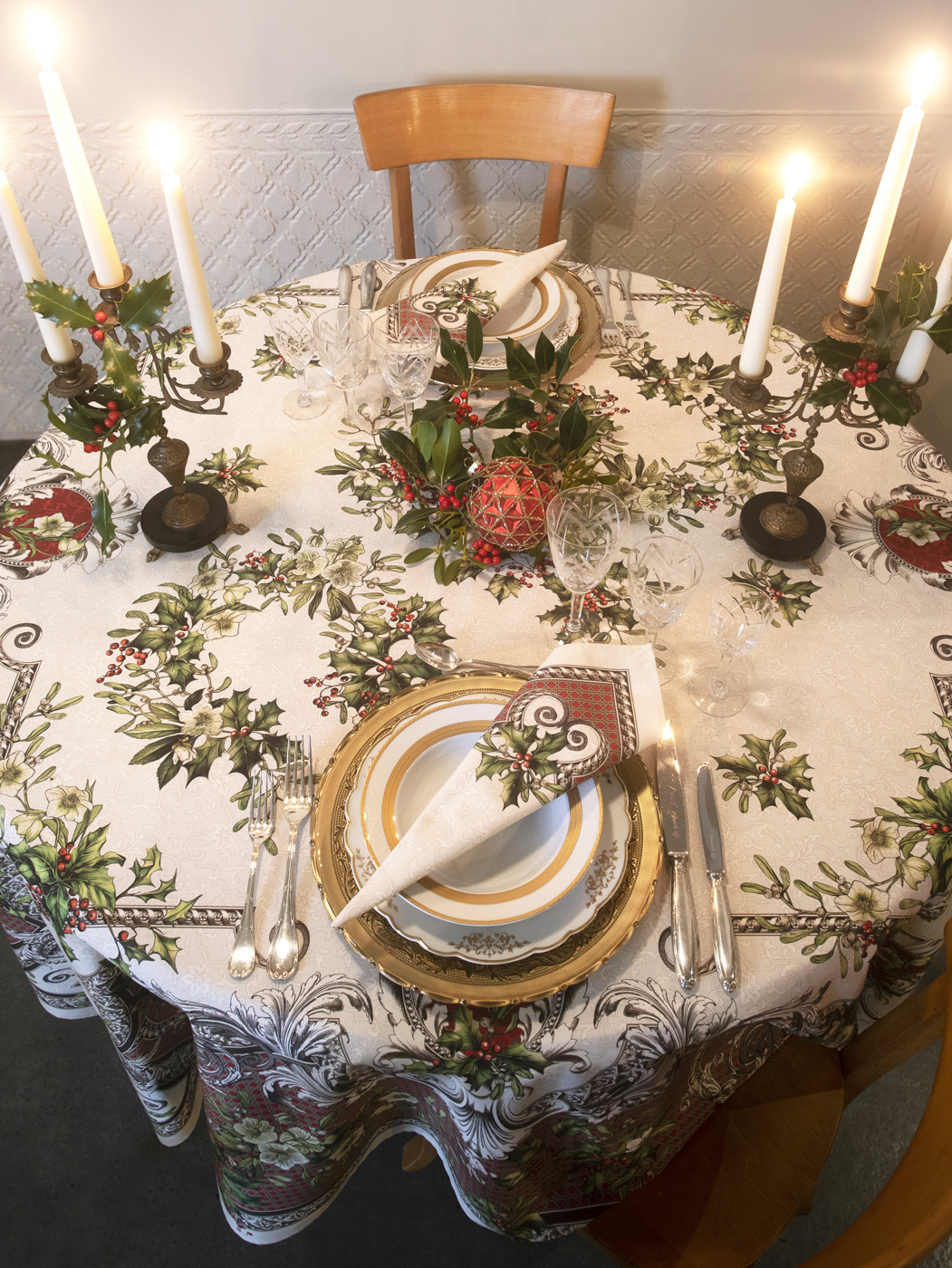 Entre le houx et le gui ornant de cette poésie textile… la nappe de la collection «Réjouissance» sublimera votre table de fêtes de fin d’année…
