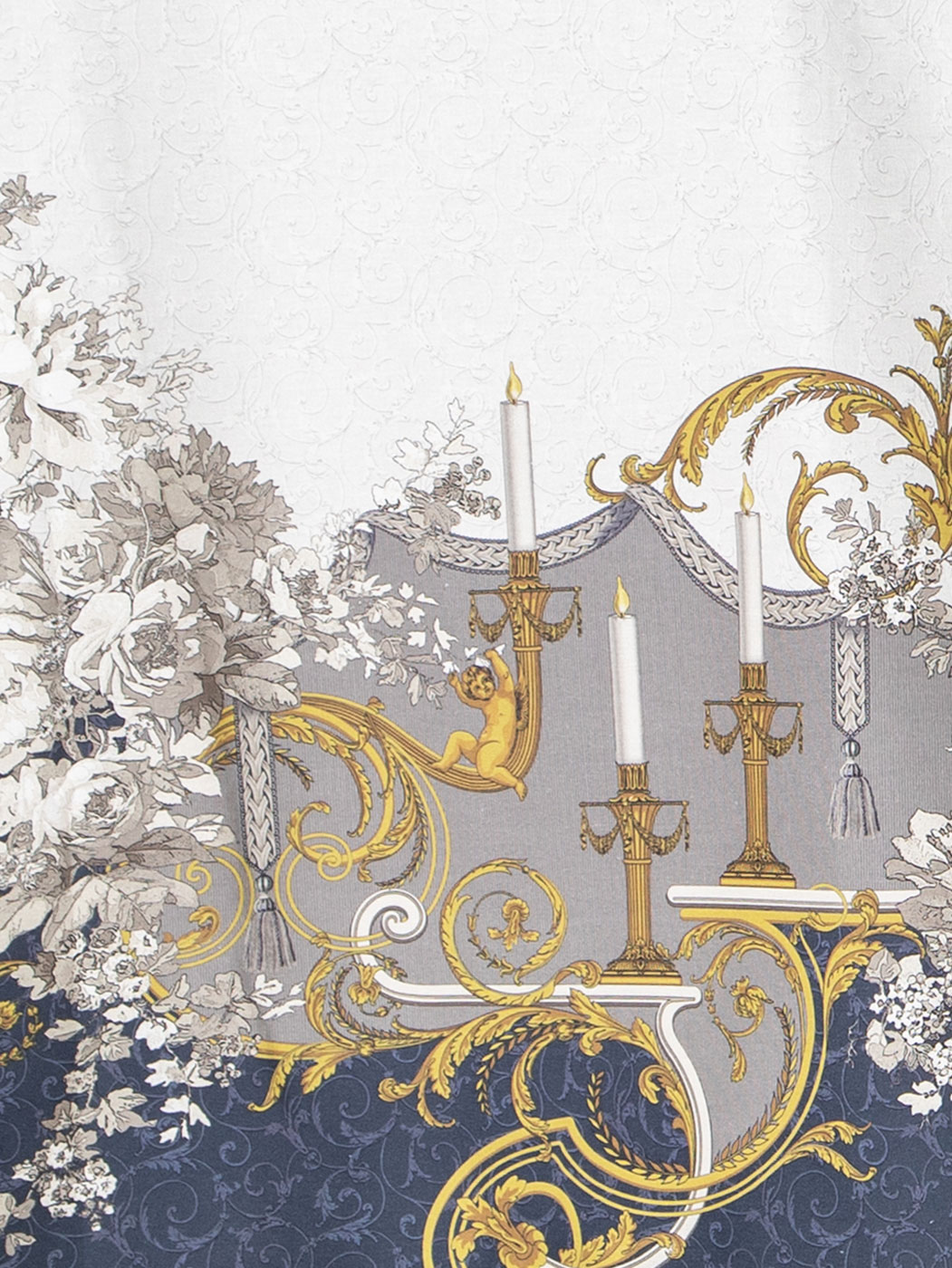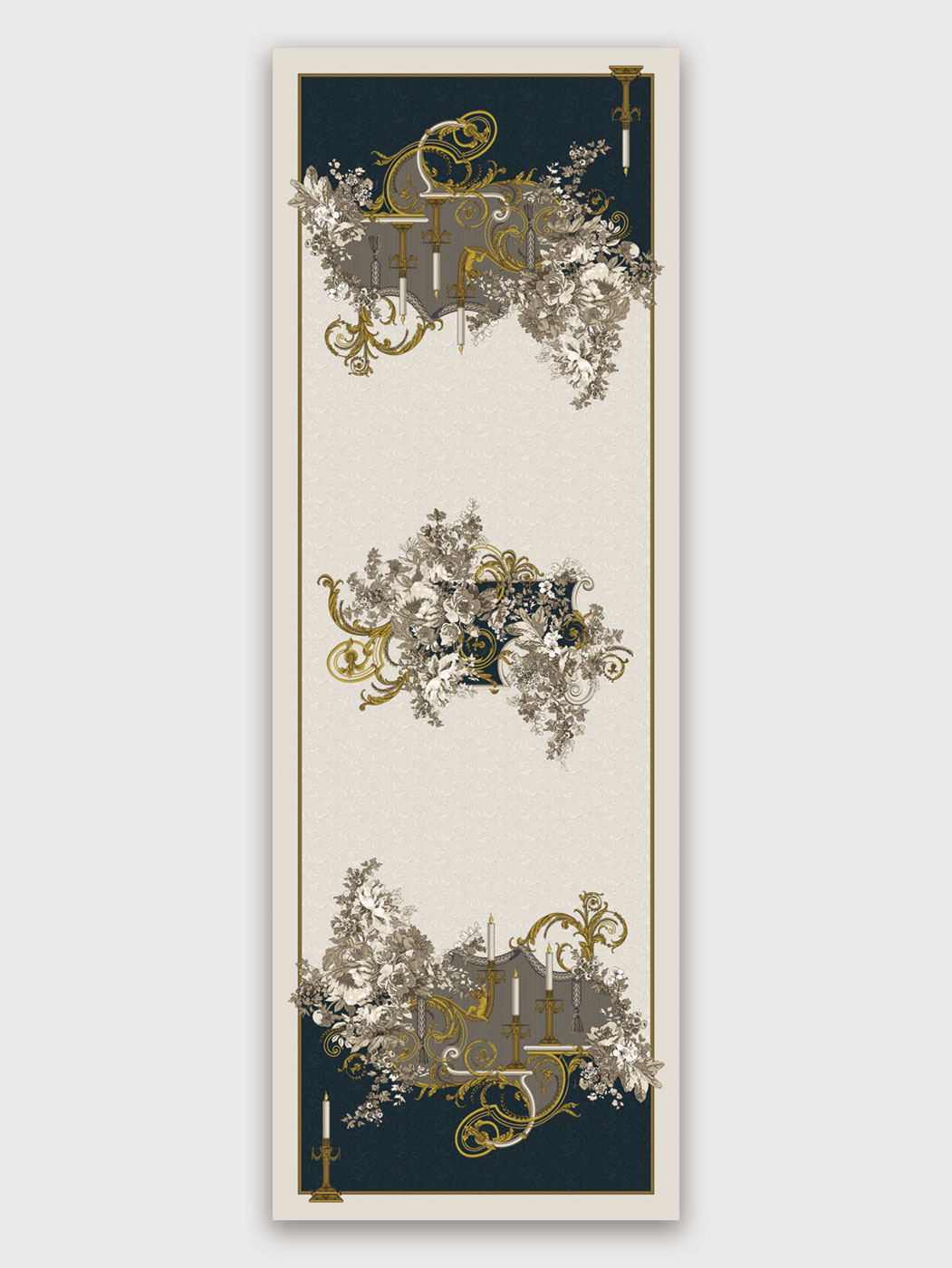 Cette étoffe est l’association même des motifs floraux foisonnants, issues des collections du Musée du Papier Peint de Rixheim à la Commanderie et des chérubins s’adossant aux volutes des branches des candélabres de bronze doré Louis XV, entremêlées aux riches passementeries d’un passé artistique dans les arts du luxe et du savoir-faire, ou la France durant 2 siècles rayonna du « Bord du Monde » aux rives de Mulhouse , comme Versailles su briller sur l’Europe .