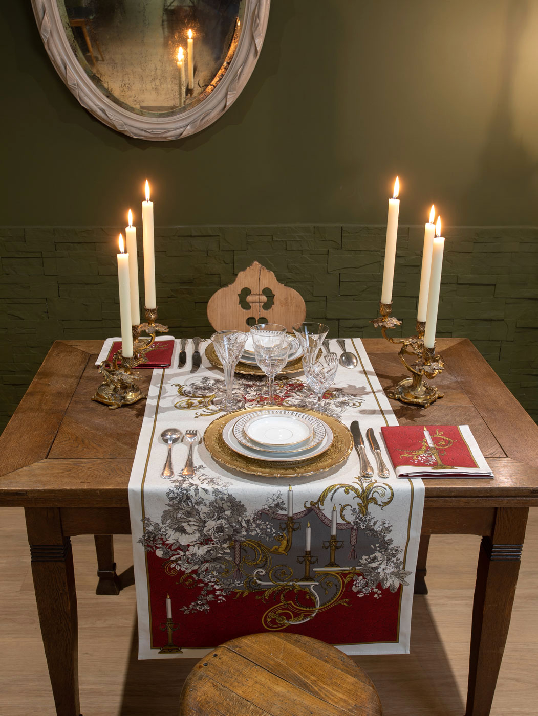 Pour un Noël tradition, optez pour l’union du rouge baroque et de l’or sur fond craie…