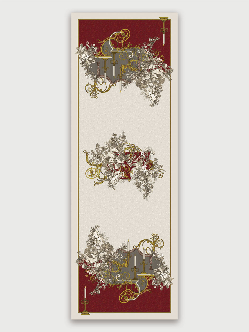 Célébration, tel est le nom de ce majestueux tissu, lequel est le syncrétisme même des arts du 18ème siècle et de ceux du second empire, période faste s’il en fût, et, qui est caractérisé par la flamboyance des couleurs, le délié des motifs rococo Louis XV associé à la splendeur fastueuse des décors Napoléon III.