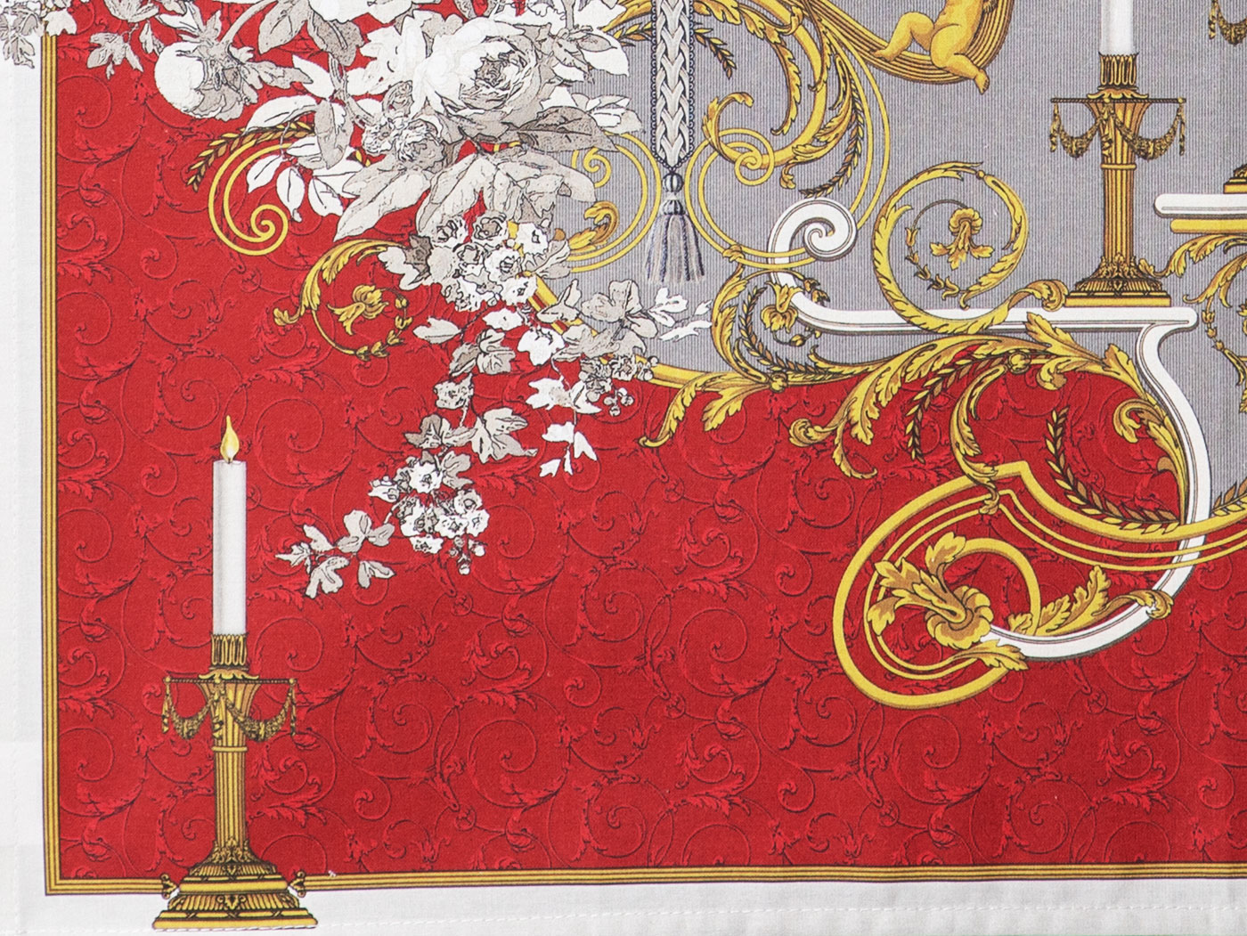 Cette étoffe est l’association même des motifs floraux foisonnants, issues des collections du Musée du Papier Peint de Rixheim à la Commanderie et des chérubins s’adossant aux volutes des branches des candélabres de bronze doré Louis XV, entremêlées aux riches passementeries d’un passé artistique dans les arts du luxe et du savoir-faire, ou la France durant 2 siècles rayonna du « Bord du Monde » aux rives de Mulhouse , comme Versailles su briller sur l’Europe .